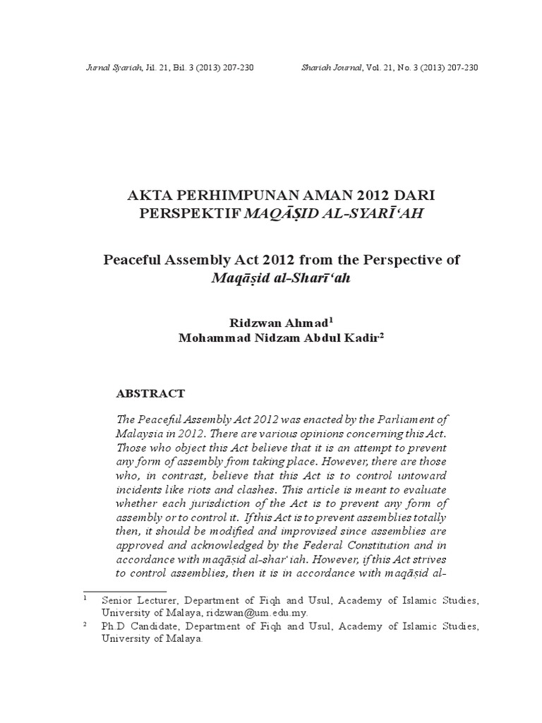Pdf Akta Perhimpunan Aman 2012 Dari Perspektif Maqasid Al Syari Ah Jurnal Syariah Um Academia Edu