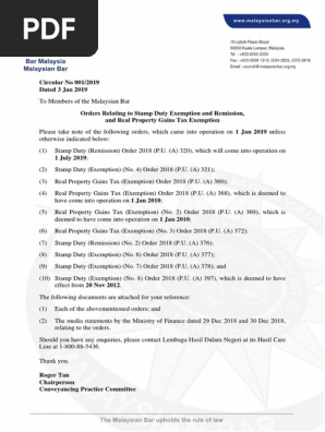 Circular No 001 2019 Stamp Duty Pdf Circular No 001 2019 Dated 3 Jan 2019 To Members Of The Malaysian Bar Orders Relating To Stamp Duty Exemption And Course Hero
